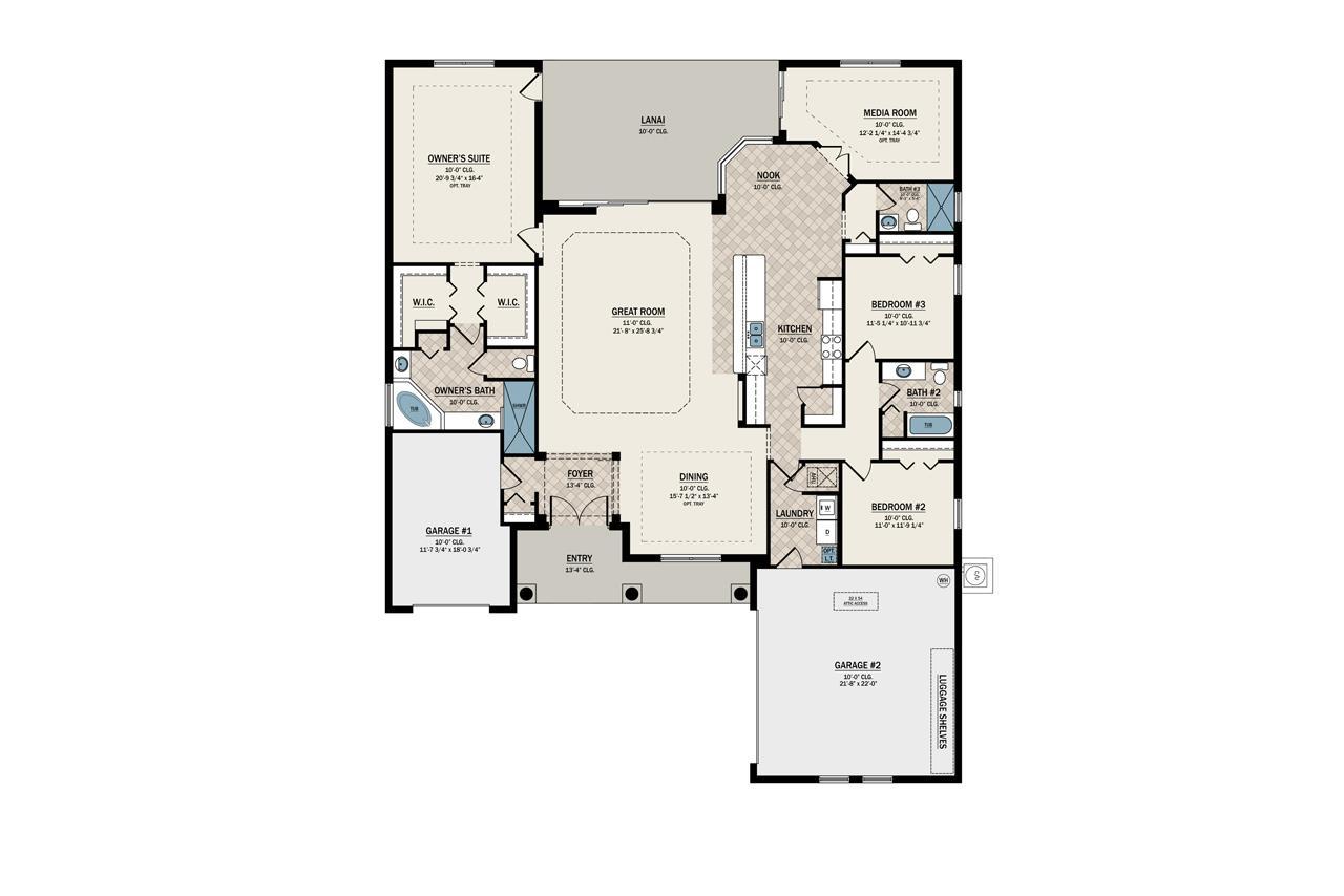 If you enjoy waking up feeling refreshed and ready for a sunny day ahead, you’ll love everything the Santa Maria 2 has to offer. This stylish, innovative home provides everything you need on one spacious floor so you have both luxury and comfort at all times. Past a charming entryway, you’ll find an elegant dining room that flows into the great room, a stunning kitchen with a contemporary island and a breakfast nook, two spacious bedrooms with two bathrooms, a media room for all of your entertaining needs, your spectacular owner’s suite and of course, an oversize lanai outside. After sunning yourself and relaxing outside, slip right into your owner’s suite to unwind. Who says you have to go to a spa to pamper yourself? Your luxurious bathroom has two walk-in closets, a walk-in shower, a soaking tub and dual vanities - all for your comfort. Best of all, this homes also comes with three garages and shelves so you have more than enough room for all the items that are import to you. As with all of our homes, a swimming pool and spa is optional for those who want to make the most of Florida living.