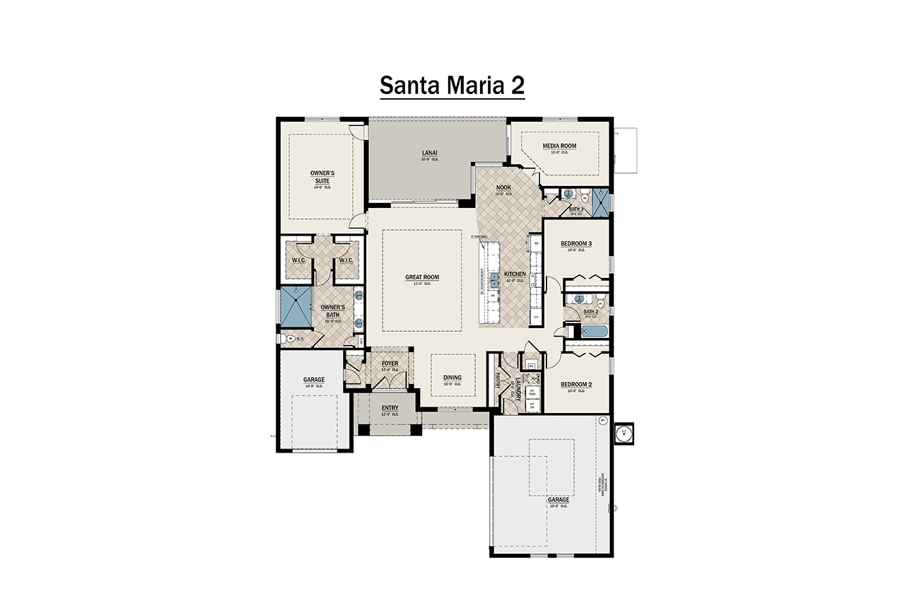 If you enjoy waking up feeling refreshed and ready for a sunny day ahead, you’ll love everything the Santa Maria 2 has to offer. This stylish, innovative home provides everything you need on one spacious floor so you have both luxury and comfort at all times. Past a charming entryway, you’ll find an elegant dining room that flows into the great room, a stunning kitchen with a contemporary island and a breakfast nook, two spacious bedrooms with two bathrooms, a media room for all of your entertaining needs, your spectacular owner’s suite and of course, an oversize lanai outside. After sunning yourself and relaxing outside, slip right into your owner’s suite to unwind. Who says you have to go to a spa to pamper yourself? Your luxurious bathroom has two walk-in closets, a walk-in shower, a soaking tub and dual vanities - all for your comfort. Best of all, this homes also comes with three garages and shelves so you have more than enough room for all the items that are import to you. As with all of our homes, a swimming pool and spa is optional for those who want to make the most of Florida living.